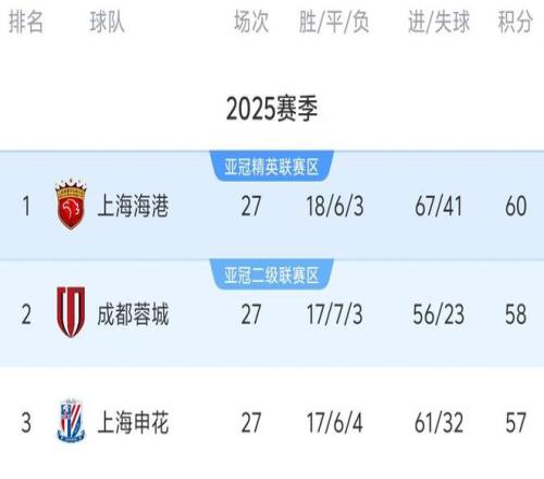 最新積分榜方面,由于爭冠3隊本輪取得全勝,前3的排名沒有發(fā)生變化。上海海港成為首支突破60分的球隊,繼續(xù)以2分的優(yōu)勢領(lǐng)跑。成都蓉城積58分排在第2,上海申花則積57分位列第3。