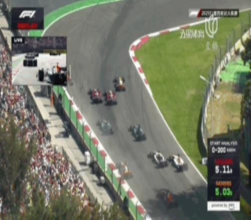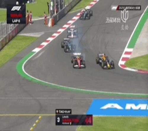 隨著五盞紅燈熄滅,墨西哥站正賽正式開始!諾里斯、勒克萊爾、漢密爾頓和起步出色的維斯塔潘幾乎并排進(jìn)入一號(hào)彎!但激進(jìn)的維斯塔潘在外線制動(dòng)出現(xiàn)問題,直接沖出了賽道駛上草坪。而勒克萊爾則在亂戰(zhàn)中,同樣因?yàn)榍袕澤令^名。