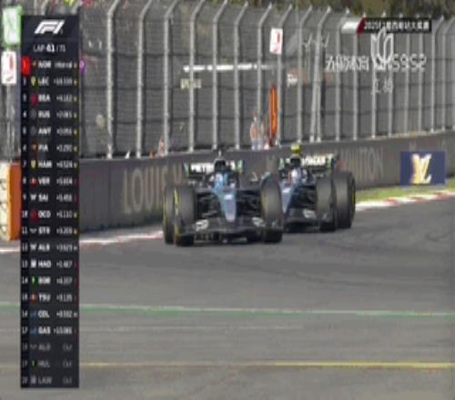 隨后在四號(hào)彎前,勒克萊爾交還位置給到諾里斯。前三名的排位沒有發(fā)生變化,維斯塔潘因?yàn)槠鹋艿那袕潄淼降谒?,拉塞爾?duì)此頗為不滿,但從隨后的回放來看,拉塞爾也同樣有切彎的動(dòng)作。