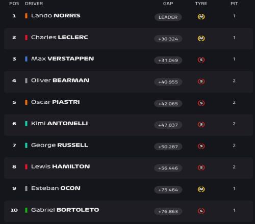 第66圈,維斯塔潘已經(jīng)追到勒克萊爾身后2.4秒!第68圈,維斯塔潘將差距縮小到了1.3秒!而后方皮亞斯特里已經(jīng)追到了比爾曼身后1.1秒!
